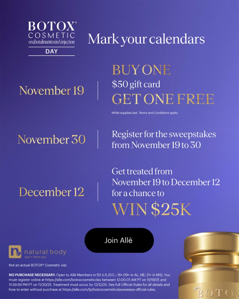 Buy A Gift CardSign up for the Botox Day Sweepstakes and receive your Botox treatment at Natural Body Spa + Med Spa between November 19-December 12, 2025 and you’ll be automatically entered for a chance to win $25,000!